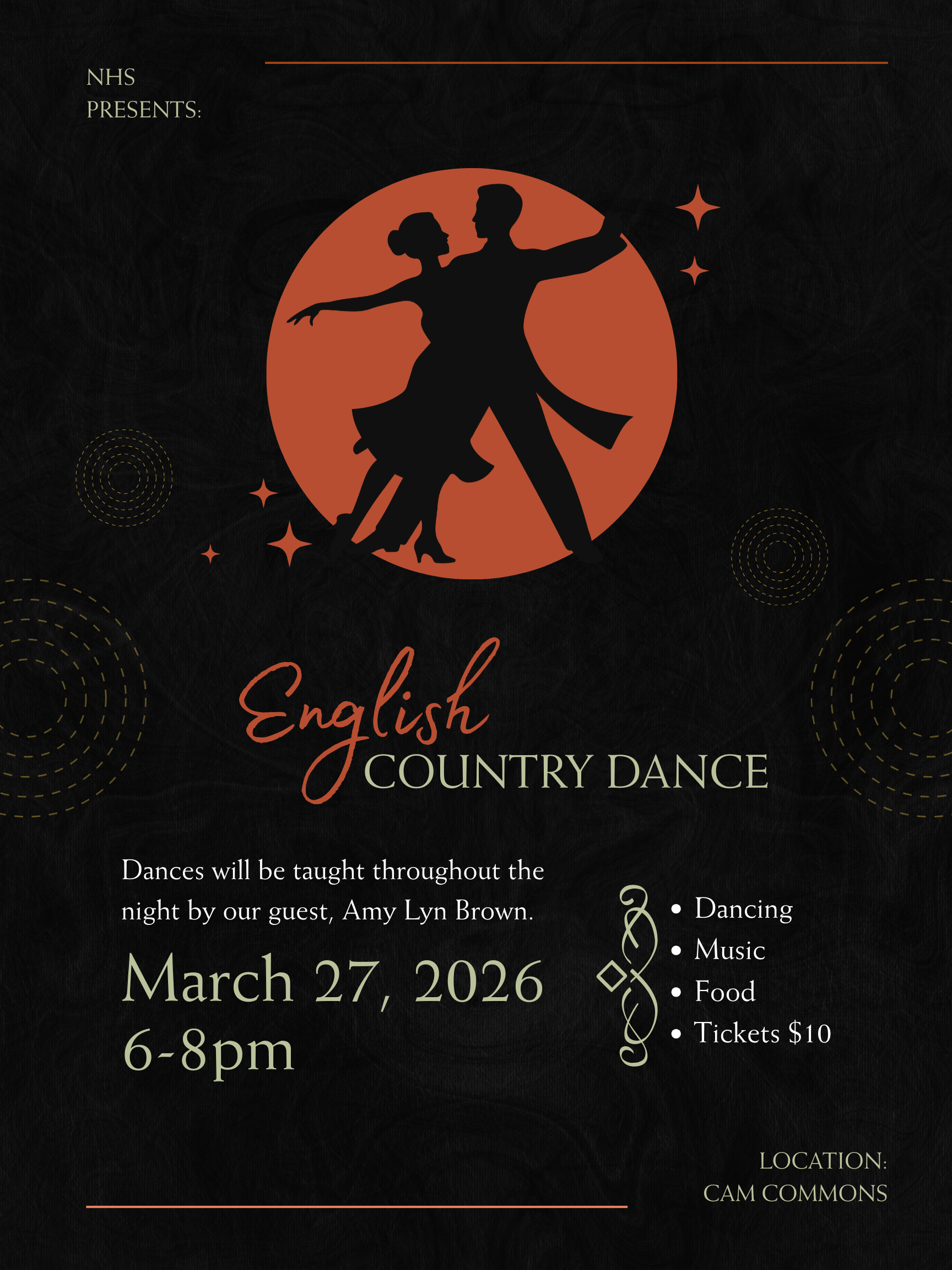 The English Country Dance is on Friday, March 27th, from 6-8 pm in the CAM commons. The cost is $10. The final date to buy a ticket and turn in your permission slip is Tuesday, March 24, by 2:30 p.m. The dress code is semi-formal, button-up shirts and pants for guys, and dresses or skirts for girls. Permission slips and guest slips can be found in the office or here in the weekly news.