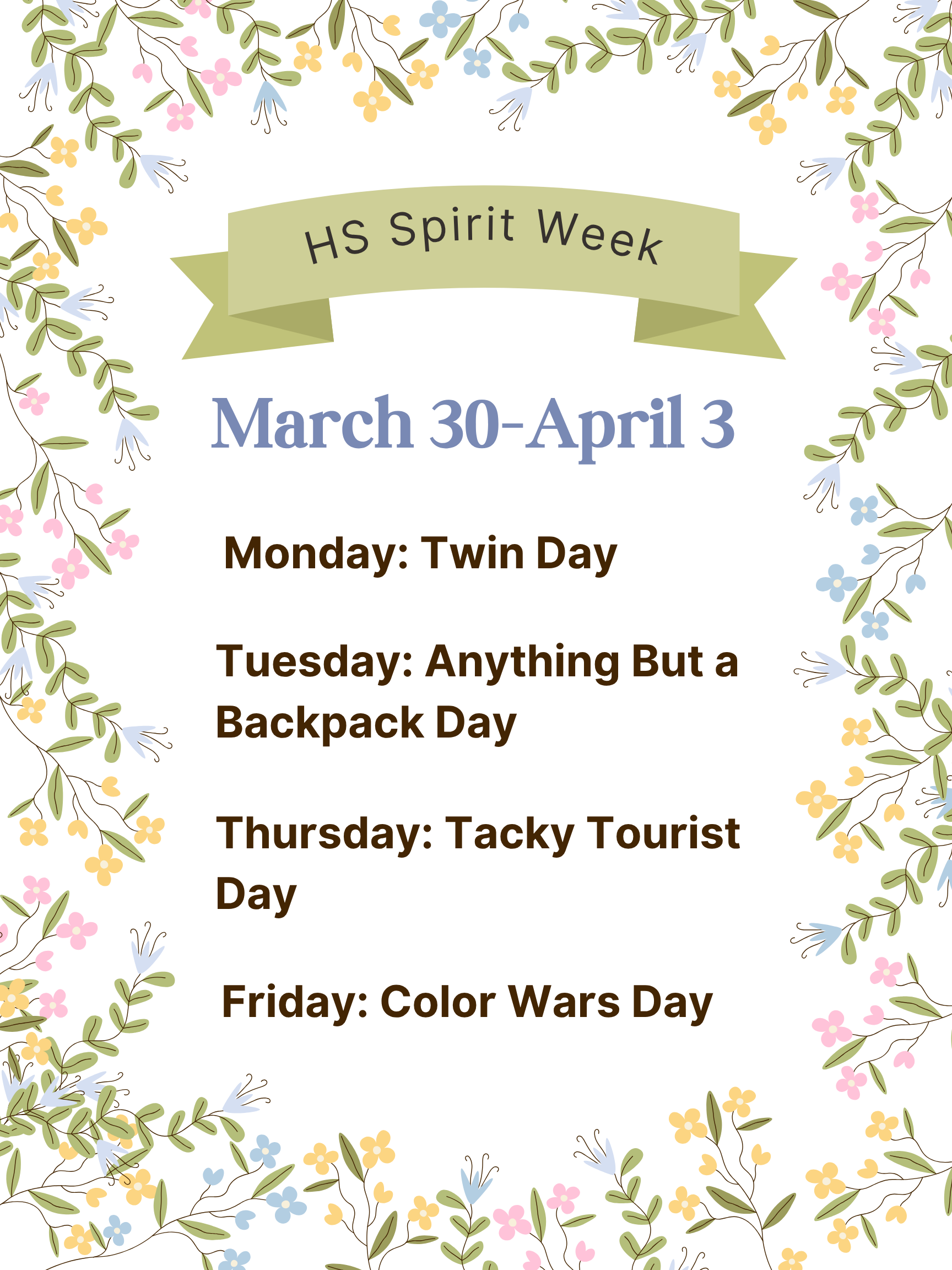 Mar 27 - Snow Make-Up Day - NO SCHOOL Mar 27 - English Country Dance 6 - 8 PM - Commons (7th-12th Grade) Mar 30 thru April 3 - High School Spirit Week Mar 31 - PBIS Student Store - During Lunches in Library